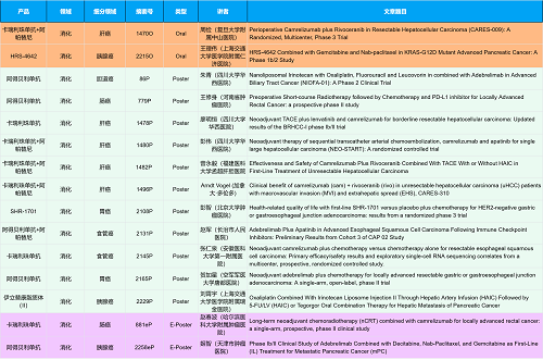 在消化系统肿瘤领域,DB真人创新产品相关研究共入选2项口头报告、10项壁报和2项电子壁报,共14项研究。除了明星药物卡瑞利珠单抗和阿帕替尼外,还有5篇阿得贝利单抗治疗消化系统肿瘤的研究入选。此外,HRS-4642、瑞拉芙普-α注射液(SHR-1701)等未上市创新产品也有相应研究入选。随着新老药物前沿研究的不断推进,有望为消化系统肿瘤患者带来新的福音!